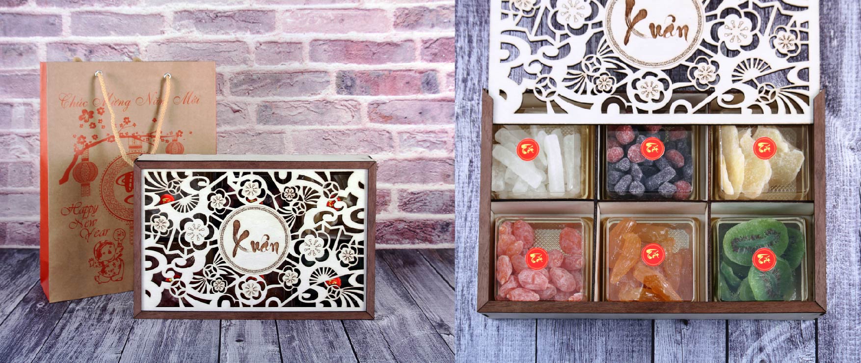 Quà tết hộp gỗ là một kiểu quà tết được đóng gói trong hộp làm bằng gỗ. Nói một cách dễ hiểu, các tặng phẩm sẽ được sắp xếp trong một chiếc hộp gỗ sao cho đẹp mắt hài hòa. Kết hợp trang trí thêm một số phụ kiện (nếu có), phần quà này sẽ được chuyển đến người nhận vào dịp cuối năm.